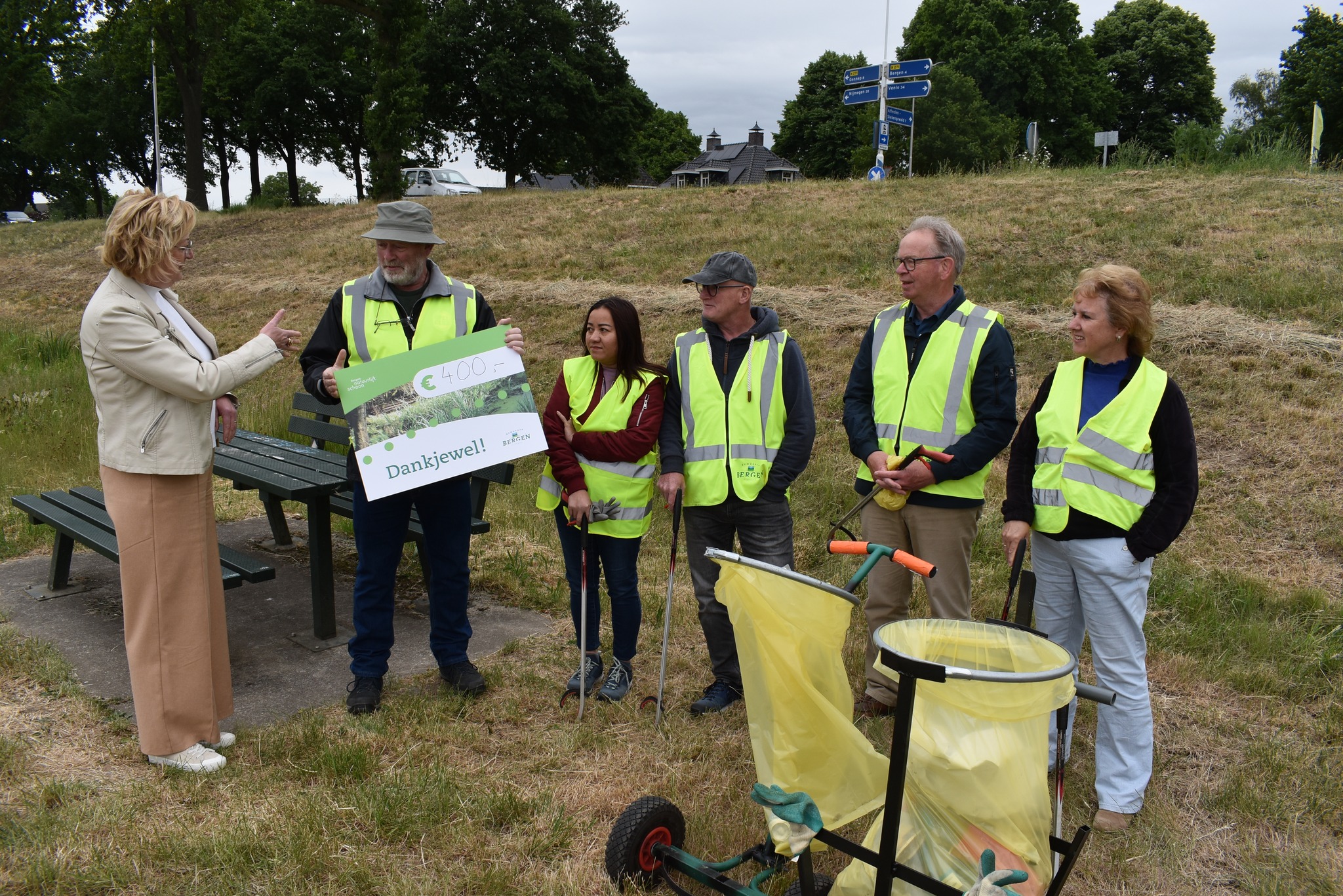 Waar zou de gemeente Bergen zijn, zonder al die vrijwilligers die regelmatig de handen uit de mouwen steken voor de gemeenschap. Zo zijn er in de gemeente diverse greenteams actief die gewapend met grijper en plastic zak het zwerfafval te lijf gaan. Wethouder Claudia Ponjee is blij met dergelijke initiatieven en spreekt graag haar waardering uit voor het werk dat deze vrijwilligers oppakken. Zo heeft zij al diverse greenteams verrast met een dankjewel in klinkende munt. Afgelopen zaterdag toog de wethouder naar Afferden waar zij de 8 personen sterke bermafvalploeg verraste met een cheque ter waarde van 400 euro.