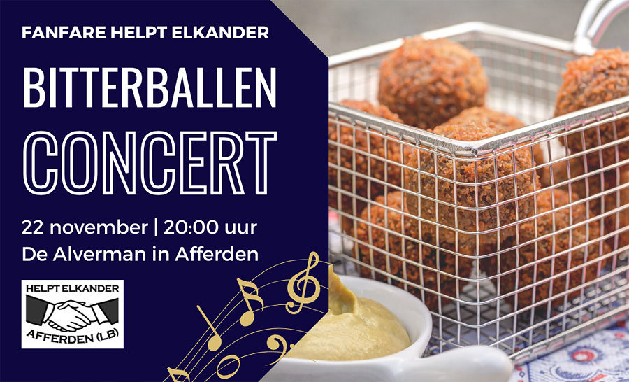 Op vrijdagavond 22 november om 20:00 uur geeft Fanfare Helpt Elkander een bitterballenconcert in de Alverman! Een leuk, gezellig en informeel concert onder het genot van een lekkere bittergarnituur. Tijdens dit optreden zal de nieuwe dirigent Martijn Appelo voorgesteld worden die op deze avond het ‘stokje’ van de interim-dirigent Bart Wolters zal overnemen.