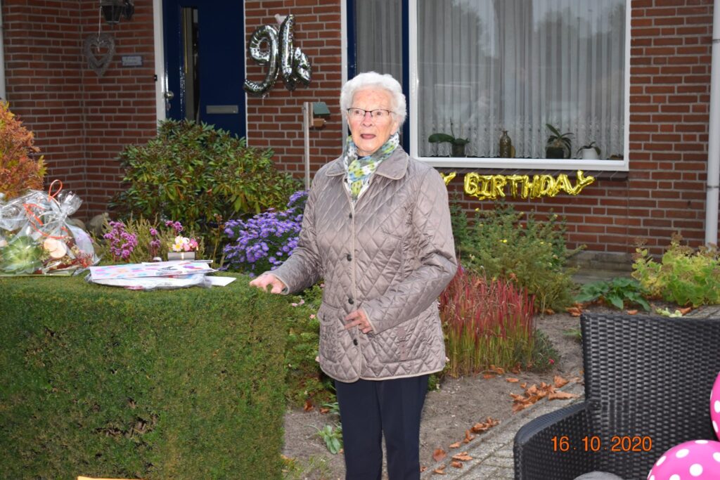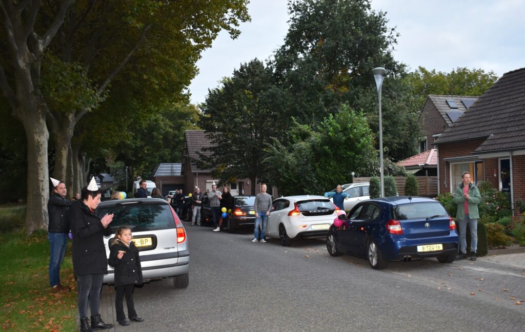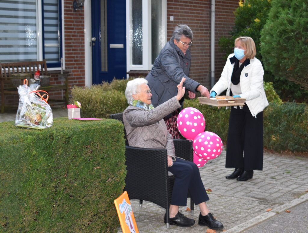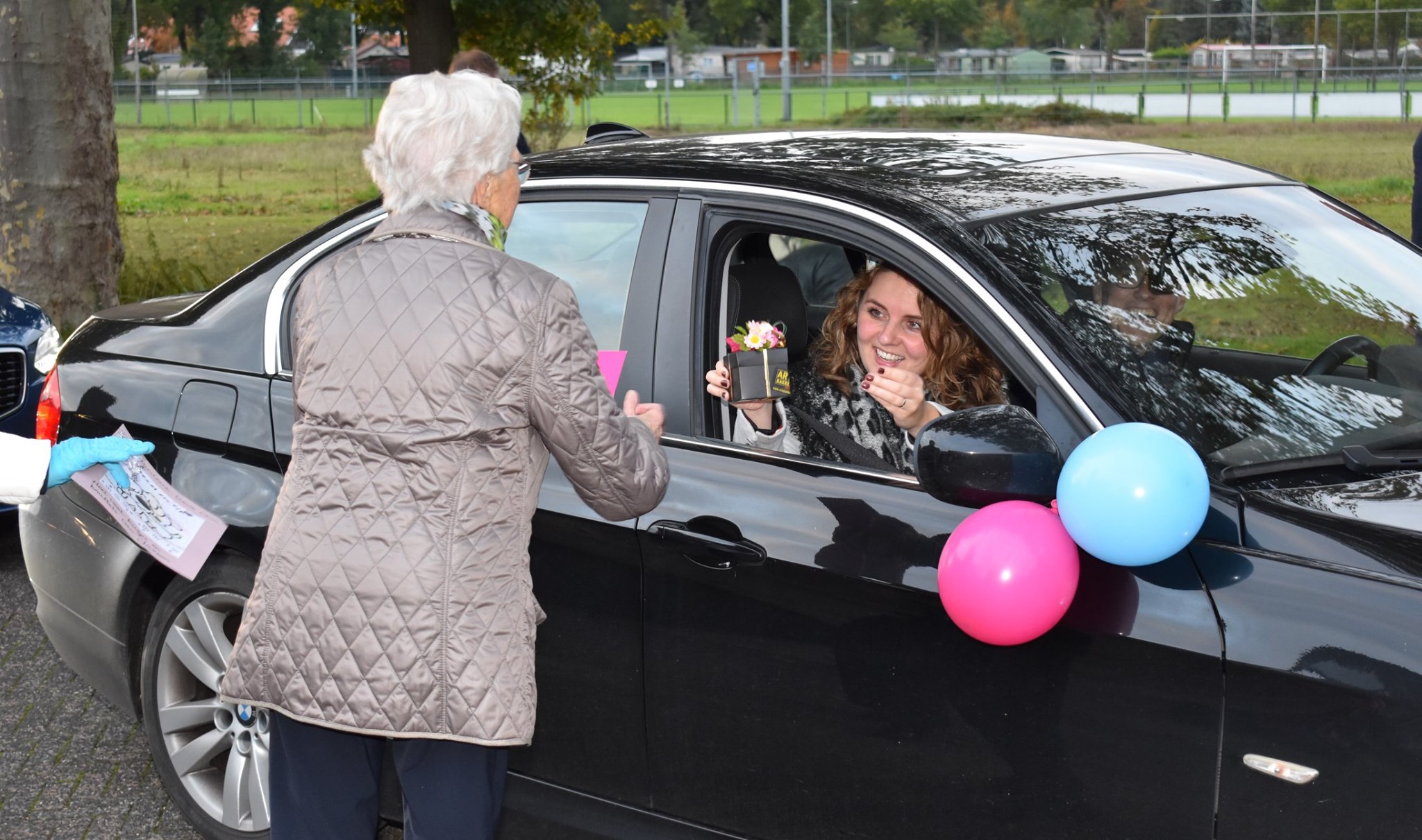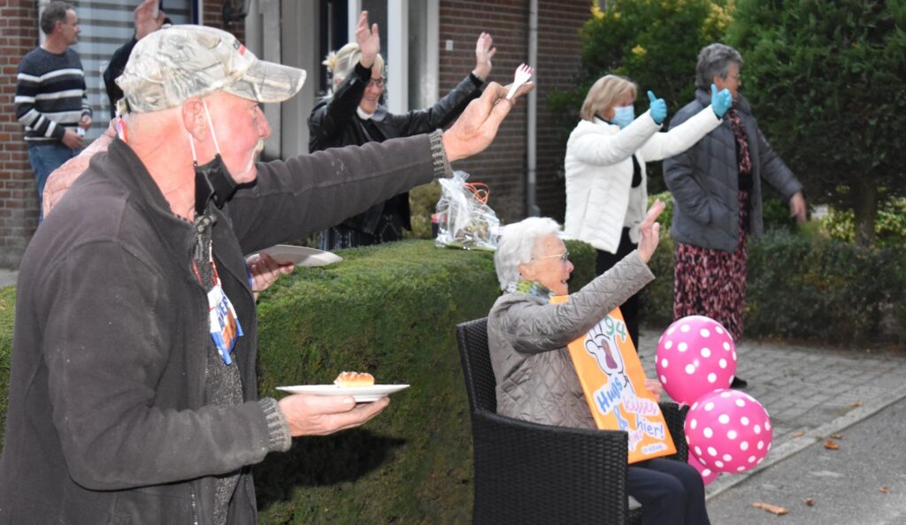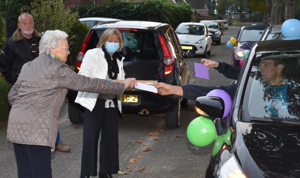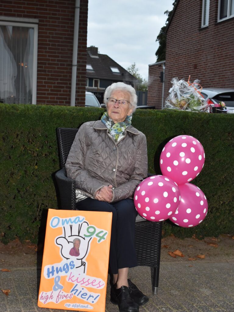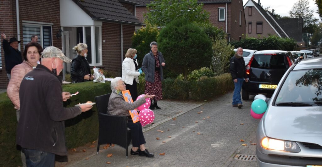 Elke auto maakte een korte stop om met inachtneming van de anderhalve meter afstand vanuit het voertuig een envelop of een cadeautje aan de jarige te overhandigen. Na de eerste autoronde, volgde nog een tweede en hierna nog een derde en oma Ruhl genoot volop. Tot slot zongen de kinderen, klein- en achterkleinkinderen en de buurt met een gezamenlijke ‘lang zal ze leven’ de 94-jarige op veilige afstand toe. “Wat een bijzondere fijne verjaardag, ondanks corona”, merkte oma Ruhl na afloop op. Zeker is dat zij nog nooit eerder zoveel handkusjes op afstand gegeven heeft als vandaag op haar 94ste verjaardag.