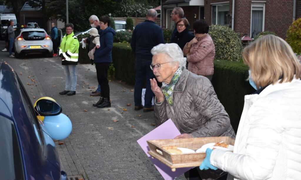 Het coronavirus gooide dit jaar echter roet in het eten. De familie verzon daarop een ludieke actie en bezorgde oma Ruhl een bijzondere 94ste verjaardag. Het was even na zessen toen een stoet versierde auto’s al toeterend de Straatakkerweg inreed om de 94-jarige te verrassen. Oma Ruhl zat nietsvermoedend buiten aan de straatzijde in een versierde stoel te wachten op datgene wat er komen zou. Buurtbewoners kwamen inmiddels toegelopen en links en rechts verschenen gebakschaaltjes met diverse soorten gebak.