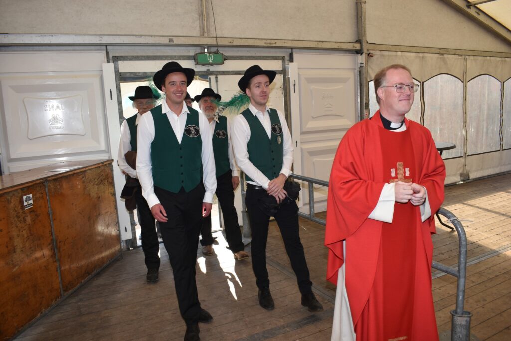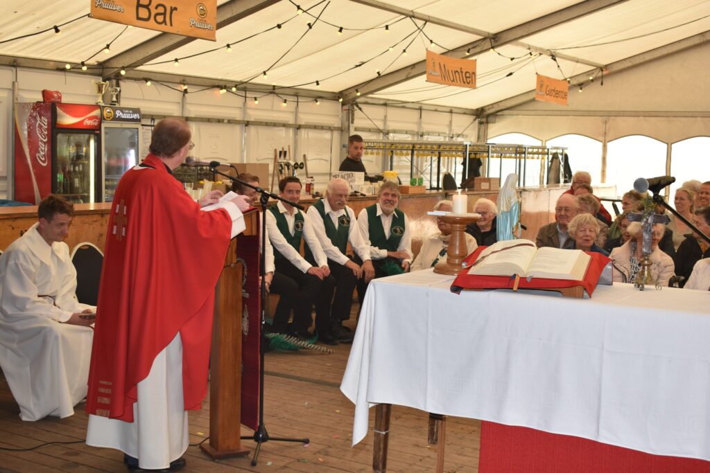 Onder begeleiding van de Offerse schutterij Prins Hendrik en gelegenheidsacoliet Luuk van De Pruuver maakte pastoor Blom zijn entree in de goed bezette feesttent. Hij begroette de aanwezige schutterijleden en feliciteerde de leden met hun koningstitels waarna hij stilstond bij de 2 patroonheiligen van de kerk: Cosmas en Damianus. Voor begeleidende zang zorgde gemengde zangvereniging Laetitia. Na de mis was er voor iedereen een alcoholvrij drankje en een broodje.