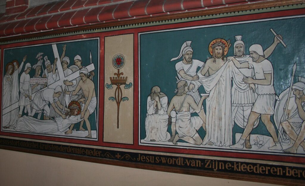 De binnenruimte (breedte en lengte 5,50 m) wordt gevormd door de zes pilaren die de toren dragen, en een omgang (breedte 1,65 m) waar tegen de muur een kruisweg op papier is geschilderd door Hubert Bekkers, afkomstig uit Maashees. Boven aan de binnenkant van de toren zijn door dezelfde kunstenaar drie van de zogenoemde zeven smarten van Maria uitgebeeld, namelijk de voorspelling van Simeon, naar Egypte en het verlies van de twaalfjarige Jezus in de tempel.