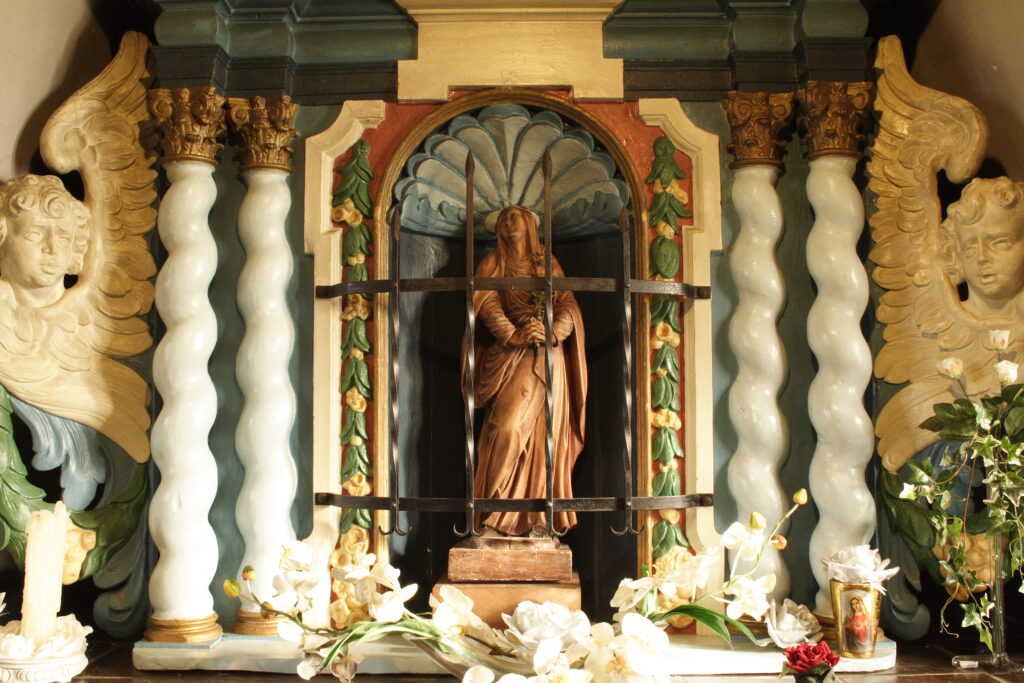 De achterwand van het kruiskapelletje wordt ingenomen door een houten barokaltaartje met vier getorste zuiltjes en een schelpnis, waarin de vereerde Mariabeeltenis staat, achter een paar tralies. Door de plaatsing van de afbeeldingen van de Smarten van O.L. Vrouw, de omgang van de neoromaanse kapel en de lagere ligging van het oude bedehuisje wordt aangegeven dat de eigenlijke devotieplaats het kruiskapelletje is met de beeltenis van O.L. Vrouw van Smarten. De neoromaanse kapel is de plaats voor gemeenschappelijke vieringen en de ruimte die de bedevaartgangers voorbereidt en leidt naar O.L. Vrouw van Smarten in het kruiskapelletje. Het 17e-eeuwse beeld (61 cm hoog) stelt Maria staande voor, het hoofd naar boven gekeerd, met een zwaard in de borst, de handen gevouwen naar beneden gestrekt. Het houten beeld is van zijn polychromie ontdaan. Uit de vooroorlogse afbeeldingen van het gepolychromeerde (met kleuren beschilderde) Mariabeeld blijkt dat O.L. Vrouw toen een witte zakdoek tussen haar handen hield. Simeon voorspelde in het evangelie volgens Lucas 2:35 het lijden van Maria aldus: ‘Uw eigen ziel zal door een zwaard worden doorboord’. In het cultusbeeld van O.L. Vrouw van Smarten te Afferden is deze profetie tot uitdrukking gebracht door het zwaard dat in haar borst steekt. De houding van Maria is alsof zij staat onder het kruis van haar zoon; daarmee verwijst het cultusbeeld tevens naar Maria’s werkelijke smart onder het kruis vlak voor de dood van Jezus, ook al is de gekruisigde zelf niet weergegeven.