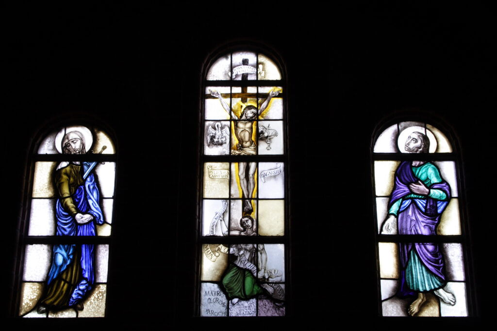 Al deze schilderingen zijn 65 cm hoog en 92 cm breed. In de drie glas-in-loodramen boven de ingang van het kruiskapelletje de vlucht is in het midden de gekruisigde Christus weergegeven, links Maria met een zwaard in haar borst en rechts Sint Jan. Aan de voet van het kruis bevindt zich een vrouwelijke figuur, die een banderol draagt met de volgende tekst: ‘”Mijn volk, wat heb Ik u aangedaan”, renovatie augustus A.D. 1952’. Helemaal beneden wordt vermeld: ‘Matri dolorosae parochus juli A.D. 1942’. Het raam is gesigneerd door Henk van de Burgt. Het werd door de Afferdse parochie aan O.L. Vrouw van Smarten geschonken tijdens de oorlog en is in 1952 gerestaureerd en herplaatst. Het middelste glas-in-lood-raam stelt aldus de vijfde smart van Maria voor: de kruisiging. De twee laatste smarten van O.L. Vrouw zijn in het kruiskapelletje zelf afgebeeld: links de pietà, rechts de graflegging. Beide glas-in-loodramen zijn in 1952 vervaardigd door Henk van de Burgt.