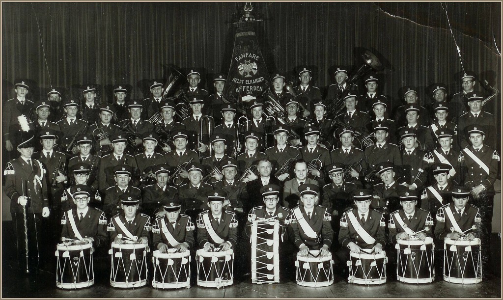 Op de foto de fanfare en de drumband in nieuwe uniformen in 1965: