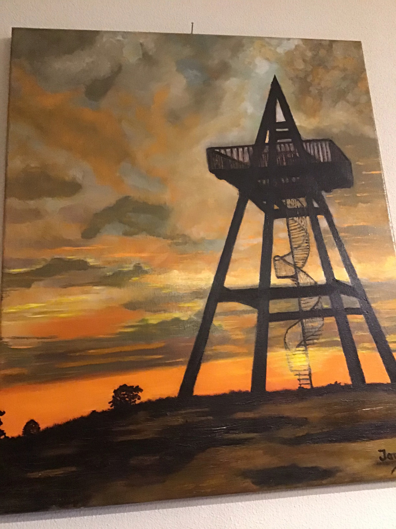 “Deze tekening van de uitkijktoren van Offere is aan de hand van een foto nageverfd en getekend, naast de uitkijktoren staat ik zelf met losse haren…”