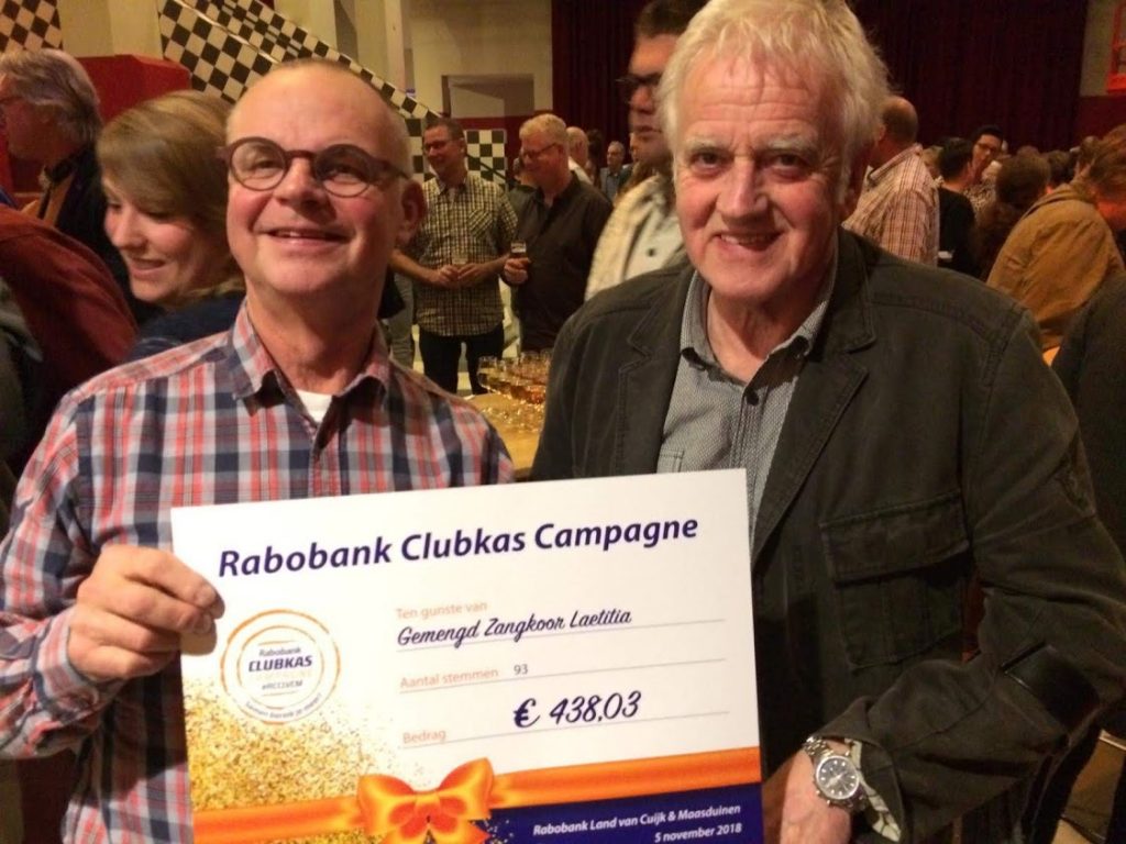Op maandag 5 november hebben we de cheque van de Rabobank Clubkas Campagne in ontvangst mogen nemen. Wij zijn heel blij met het mooie bedrag van €438,03. Iedereen die op Laetitia heeft gestemd bedanken we hartelijk.