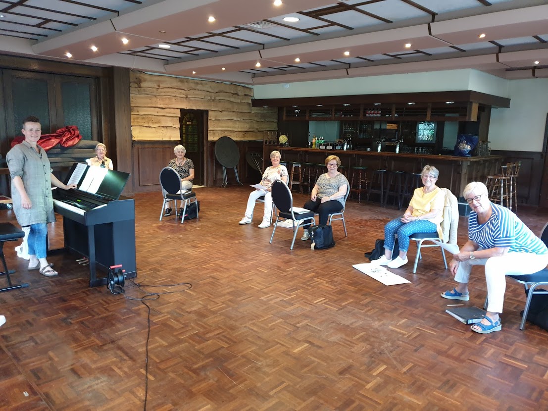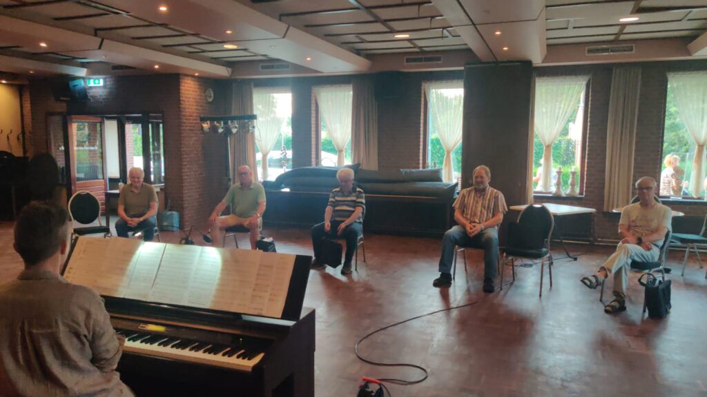 Hoewel nog niet iedereen kon meedoen, konden we op maandag 28 juni voor het eerst weer repeteren bij De Pruuver: nog wel in kleine groepen en uiteraard op gepaste afstand.