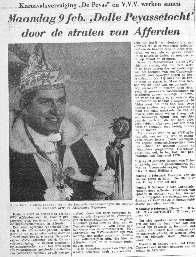De plaatselijke V V V – afdeling en de Carnavalsvereniging, die beiden eendrachtig samenwerken voor het welslagen van verscheidene openluchtmanifestaties (waarvan een ieder gratis kan genieten), doen een zeer dringend beroep op alle dorpsgenoten, verenigingen en buurtschappen, om in zo groot mogelijke getale mee te doen aan de Carnavalsoptocht ( ……. en later aan het Corso van de Zomerfeesten). Het Carnavals- en V V V -bestuur zijn van mening, dat zulke optochten geweldige volksfestijnen zijn, die hier in Afferden nooit en te nimmer teniet mogen gaan. In de maanden januari en februari, waarin iedereen toch ruimschoots vrije tijd heeft (wij denken b.v. aan vorstverlet) is er voldoende gelegenheid om de handen eens te laten wapperen, en originele en gekke ideeën om te zetten in daden, en met carnaval op straat te brengen.