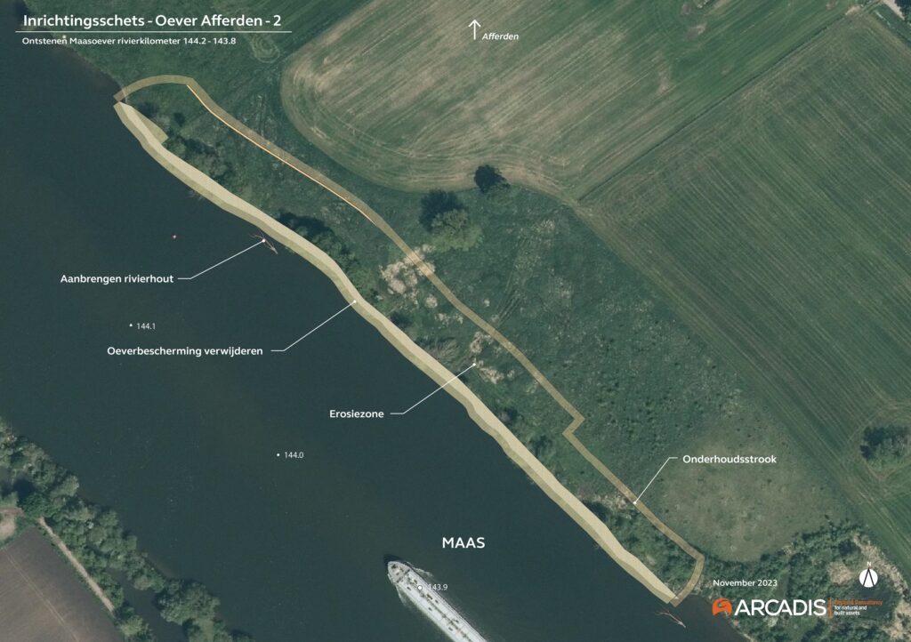 In de periode eind januari tot oktober 2026 werkt aannemer Boskalis-Wetering ter hoogte van Afferden en Bergen aan verbetering van de riviernatuur langs de Maas. Ter voorbereiding wordt een deel van de vegetatie op de oever verwijderd. Daarna staat het weghalen van de harde oeververdediging op het programma.